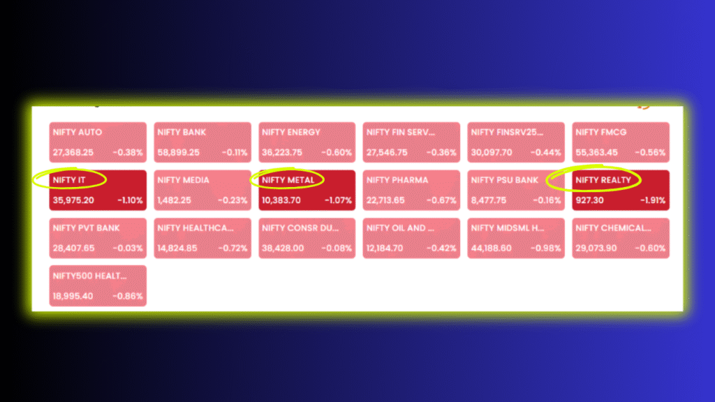 Sector-wise performance showed that IT, realty, and certain financial stocks were among the top drags on the indices.
